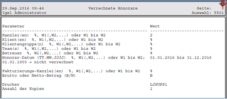 Wird im untern Block einer Auswertungsmaske die Seite 0 mit J definiert, so druckt IGEL vor jeder Auswertung ein Deckblatt mit den definierten Parametern. Diese Funktion wurde in alle Auswertungen der Honorarverrechnungs-Statistiken… und Klienten-Statistiken… eingebaut: