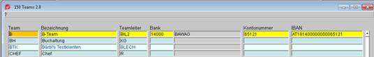 Hier wird der Team-Kurzcode eingegeben, welcher frei definierbar ist (alphanumerisch 8 Stellen). Im Feld Bezeichnung wird der Name des Teams eingegeben (meistens der Name des Teamleiters), im Feld MA wird der Mitarbeiterkurzcode des Teamleiters eingegeben. Hat das Team eine eigene Bankkontonummer, auf der die Honorare zu überweisen sind, so ist unter Bank die Bankleitzahl und unter Kontonummer die Bankkontonummer einzugeben.