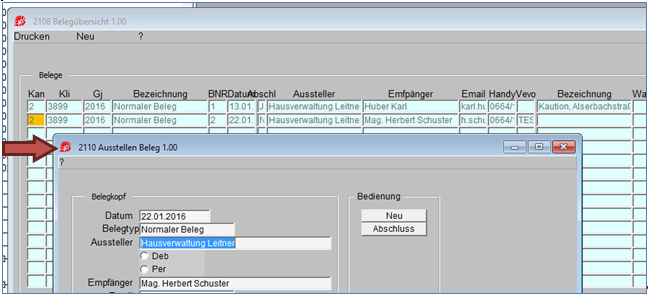 Auch in der Übersichtsmaske können Sie über das Blockmenü Neu in die Maske 2110 verzweigen und weitere Belege erfassen oder bereits erfasste Belege Drucken -> Maske 2/1111 siehe nächstes Kapitel.