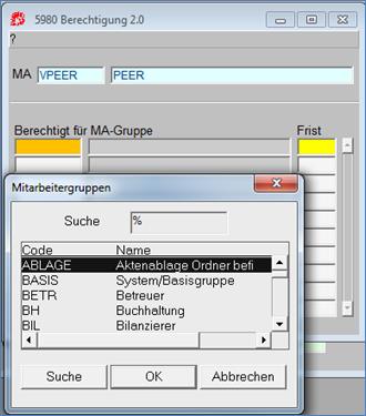 Für welche Mitarbeitergruppe ist der oben angeführte Mitarbeiter berechtigt? Geben Sie hier den Kurzcode der Mitarbeitergruppe ein (mit F8 sehen Sie alle Mitarbeitergruppen). |