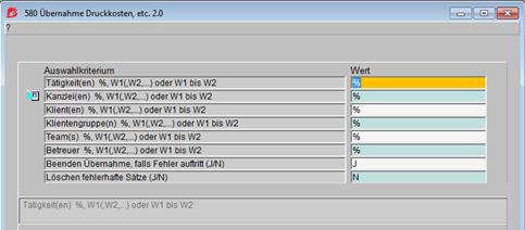 Welche Tätigkeiten sollen in die Honorarbearbeitung übernommen werden. Durch Eingabe des Kurzcodes kann die Übernahme für eine einzelne Tätigkeit (z. B. nur Buchungszeilen) gestartet werden. Der Parameter % übernimmt alle Druckkosten, Buchungszeilen und Dienstnehmer. |