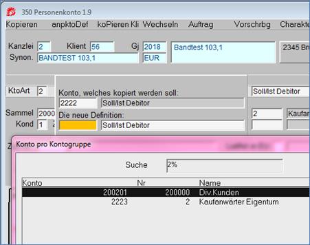Beim Kopieren eines Personenkontos in der Maske 2/350 über das Blockmenü Kopieren kann man im Feld Konto mit F8 die nächste höhere Kontonummer pro Kontogruppe auswählen.