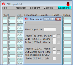 Wird von der Legende in die Menüleiste gewechselt und die Funktion Dauertermin gewählt, werden alle zugehörigen Termine vervielfacht.