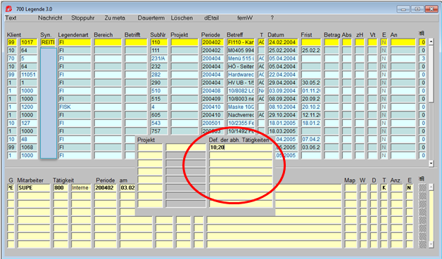 (= Subtätigkeitstext). Dieses Feld greift auf die Maske 1/5970 Allgemeine Subtätigkeiten und kann mit F8 aus einer Werteliste ausgewählt werden. |