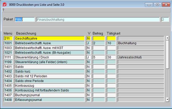 In der Spalte Tätigkeit geben Sie den Tätigkeitscode (aus Maske 2902) an, unter dem die Druckkosten auf der Honorarnote verrechnet werden sollen. Die Abfrage der Tätigkeitscodes ist mit F8 möglich. Werden alle Druckkosten auf einer Tätigkeit gesammelt verrechnet, so kann diese Spalte leer bleiben. Die Tätigkeit für die Verrechnung wird dann aus der Maske 8098 genommen. |