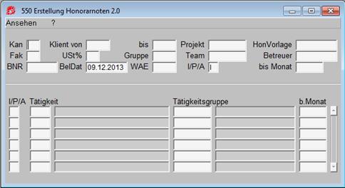 Die einzigen Felder die zwingend eine Eingabe verlangen, sind Kan (Kanzlei) und bis Monat (bis zu welchem Monat verrechnet werden soll).