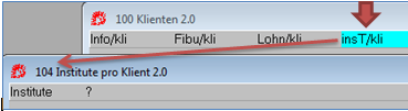 Zur Anlage und Zuordnung von Finanzamt und Banken wechselt man von der Maske 100 Klienten mit der Taste F3 in die Menüleiste, und ruft mit T den Menüpunkt insT/kli auf. Man befindet sich nun in der Maske 104 Institute pro Klient.