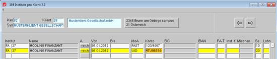 Es ist daher unbedingt notwendig, dass diese Maske gewissenhaft gewartet wird. Sämtliche Änderungen bei Finanzamt und Bankverbindung sind unbedingt hier zu erfassen. Ein angelegtes Institut kann, aufgrund der oben erwähnten Vielfältigkeit der Verwendung, nicht mehr gelöscht werden.