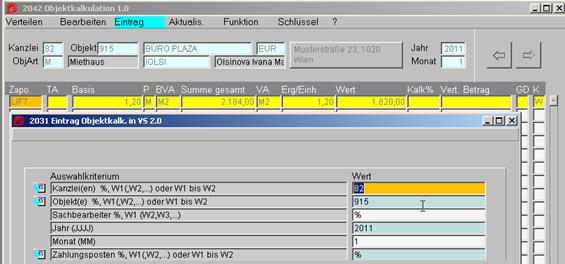 Mittels dem Blockmenü Eintrag können nun die kalkulierten Werte in die Maske 10/402 übernommen, also eingetragen werden. Mit dem Aufruf des Blockmenüs Eintrag öffnet sich die Maske 10/2031: