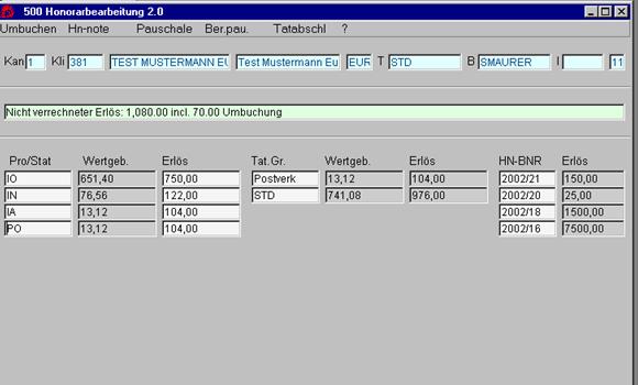 Hier haben Sie eine Ansicht der noch nicht abgerechneten Leistungen, gereiht nach deren Abrechnungsstatus. Ebenso kann man die Beträge der abzurechnenden Honorare abändern und Umbuchungen durchführen.