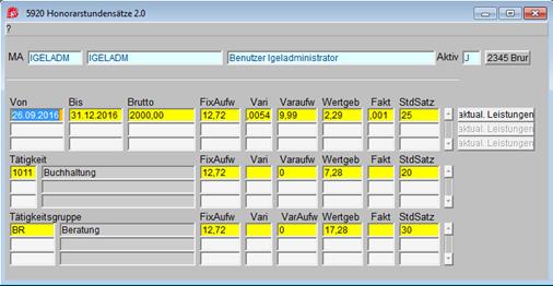 Hier können Sie Ihre Honorarstundensätze pro Mitarbeiter, Tätigkeit oder Tätigkeitsgruppe definieren.