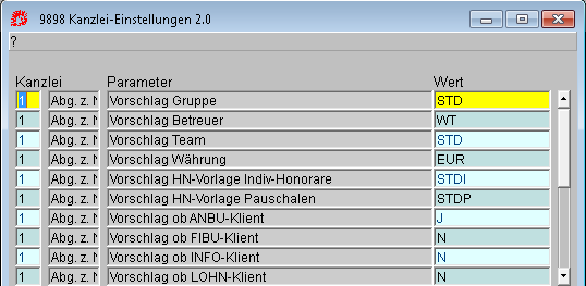 In der Maske 9898 können pro Kanzlei die Werte pro vorgeschlagenen Parameter eingegeben werden, diese Einstellungen werden bei der Anlage eines Klienten in 1/100 bzw. in 1/200 übernommen.