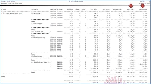 Pro Klient erhalten Sie eine Summe über alle Spalten, sowie eine Gesamtsumme aller Werte am Ende der Liste.