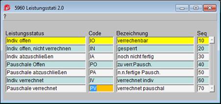 Hier sehen Sie alle möglichen Leistungsstatus, die in der Honorarbearbeitung Maske 500 vorkommen können.