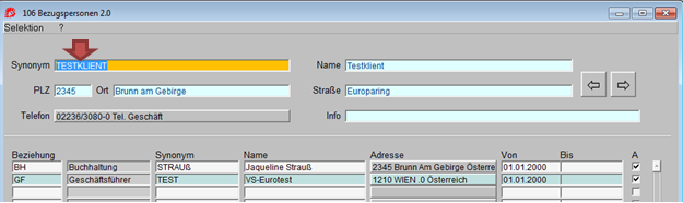 wird im Feld Beziehung der gewünschte Beziehungscode (=Bezugsperson) eingeben: z.B. „RA“ - Rechtsanwalt des Klienten. Eine Abfrage auf die in 9718 angelegten Codes ist mit der Taste Werteliste (F8) möglich. |