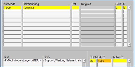 Im Beispiel zu der Maske 2900 wurde der Tätigkeitsgruppe „TECH“ das Erlöskonto 4000 zugeordnet. Der Tätigkeit 213 wird das Erlöskonto 4202 zugeordnet. Alle anderen Tätigkeiten aus dieser Gruppe werden auf Grund der Eingabe in 2900 automatisch auf 4201 gebucht – es muss nicht bei jeder Tätigkeit dieser Gruppe das Konto nochmals eingetragen werden.