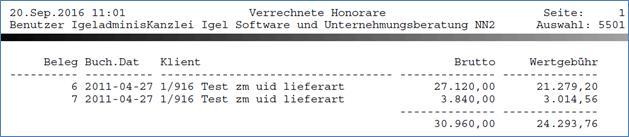 Es werden Kanzlei- und Klientennummer angedruckt, sowie der Name des Klienten. Wurde bei einem Klienten Kanzlei bzw. Klientennummer gewechselt, so sehen Sie auf dieser Liste die Nummern, die der Klient zum Zeitpunkt der Honorarnotenerstellung hatte. |